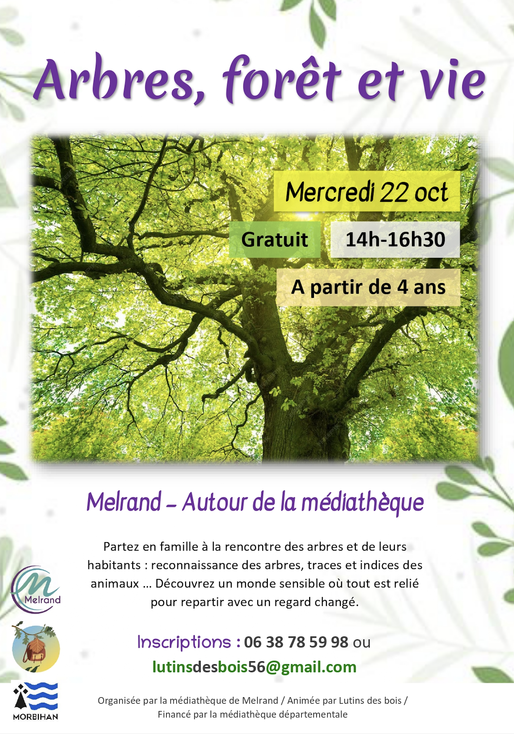 - Le 1er mercredi des vacances, soit le 22 octobre, de 14h00 à 16h30, un Atelier Nature « Arbres, forêt et vie » à destination des familles sera proposé dans le cadre de l’exposition sur « Les Arbres Remarquables en Morbihan ». Il sera animé par Lutin des Bois. GRATUIT.