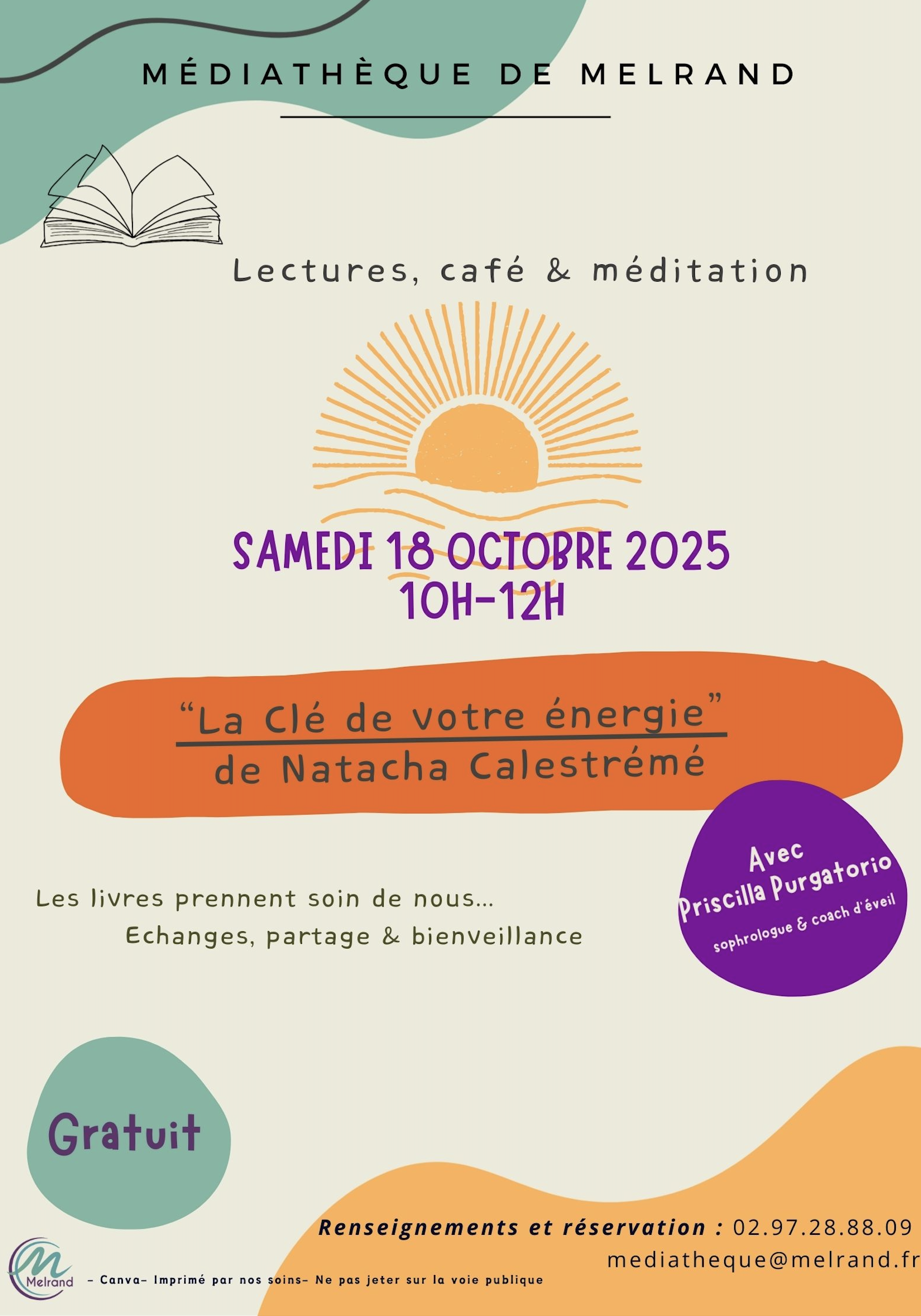 - Prochain Atelier « Lectures, café & méditation » Samedi 18 octobre de 10h00 à 12h00, autour du livre de Natacha CALESTREME, « La Clé de votre énergie ». GRATUIT.