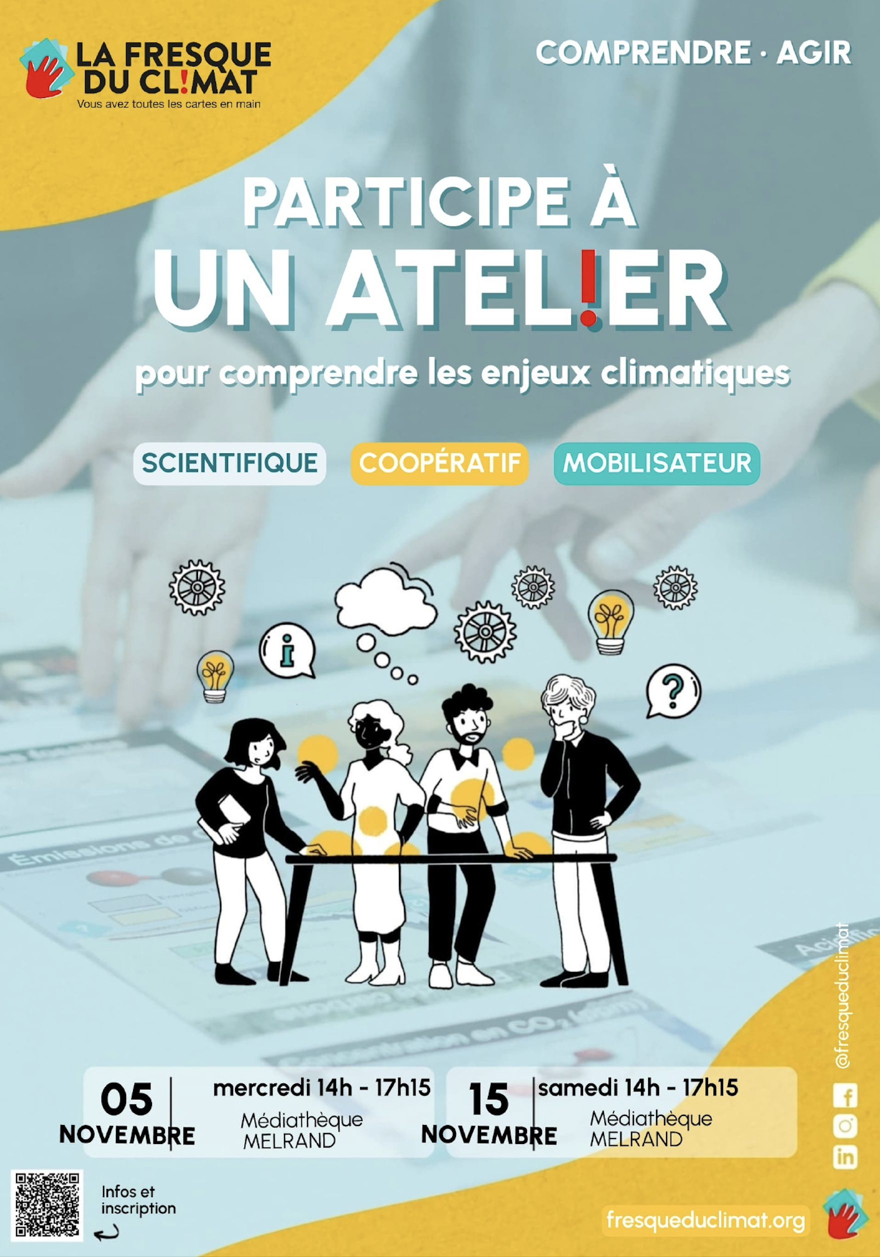 - « Atelier Fresque Climat », les 05 novembre de 14h00 à 17h15 & samedi 15 novembre de 14h00 à 17h15 proposés par Isabelle Poignant-Lesteven, animatrice certifiée en prévision de « l’Atelier 2 tonnes » prévu le 29 novembre de 09h00 à 12h00, animé par Thibault Tavernier, chargé de mission Climat à Baud Com (je t’enverrai l’affiche qd elle sera finalisée). GRATUIT.