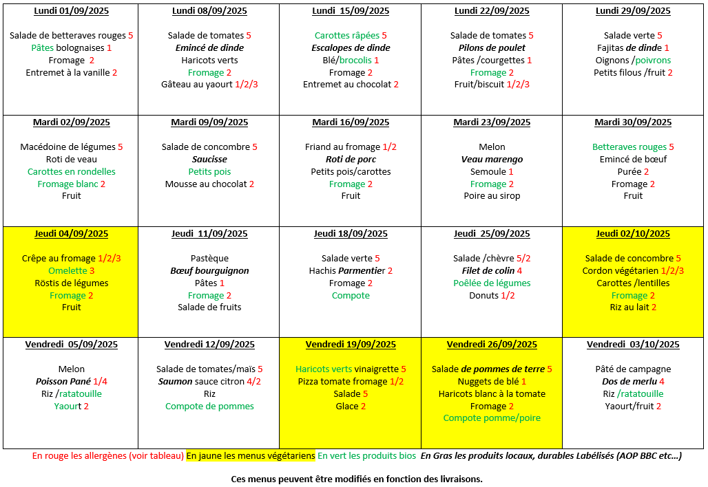La loi Egalim d’avril 2019 consiste à fixer un objectif de 50 % de plats préparés à partir de produits bio, durables ou sous signes de qualité (Bleu/Blanc/Coeur, Label Rouge, etc…) à horizon 2022 dans les restaurations collectives. Le restaurant scolaire de Melrand introduit progressivement des produits bio comme les yaourts, certains légumes et fruits de saison qui restent accessibles pour respecter les budgets et le prix des repas accessibles pour tous. Les volumes de produits bio ne sont pas toujours suffisants ou disponibles comme les haricots verts ou les tomates.