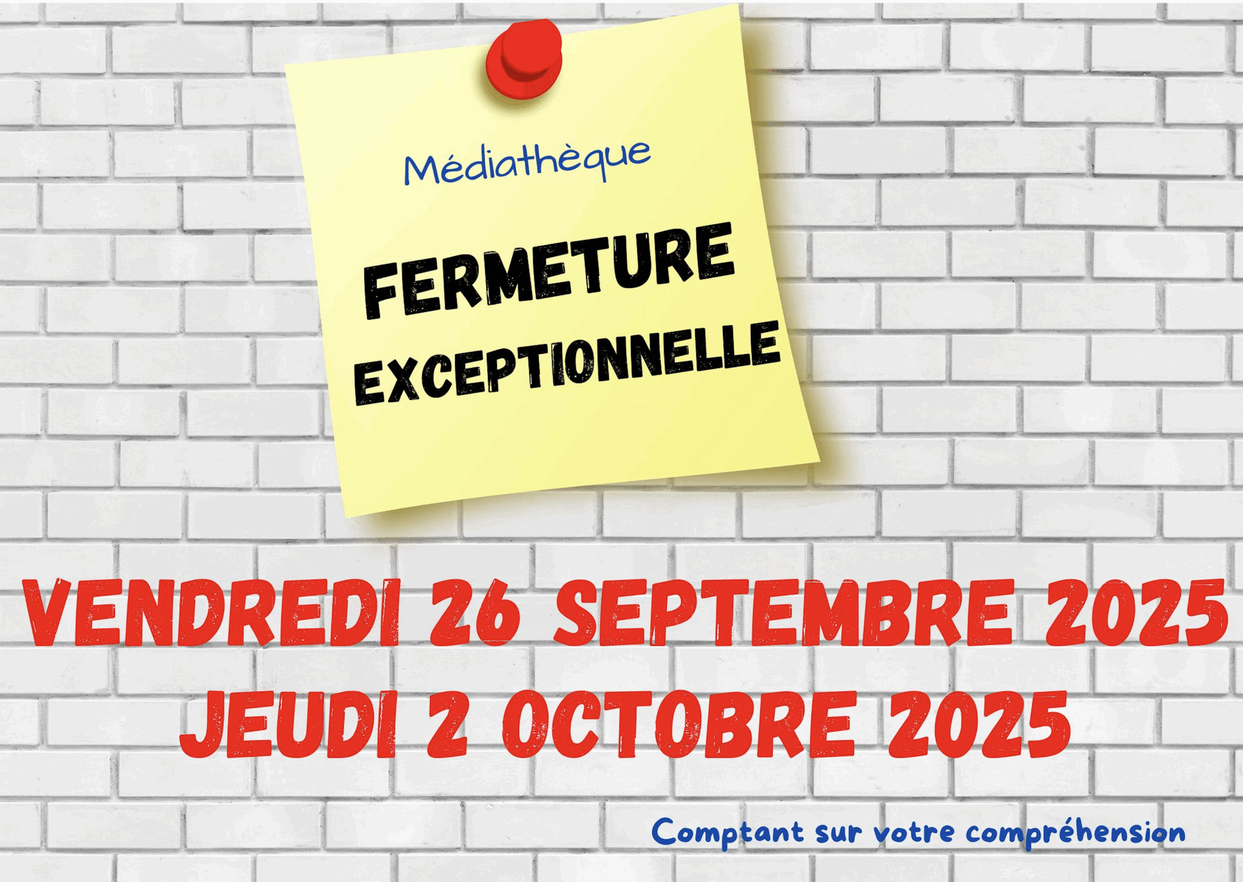 Accueil > Actualités > Fermeture exceptionnelle de la Médiathèque 2025 Fermeture exceptionnelle de la Médiathèque 2025 ActualitésPublié le 24 septembre 2025 Partagez cette page sur Découvrez nos autres actualités Publié le 6 octobre 2025Actualités Réunion publique du PPRI du bassin versant du Blavet En savoir plus Publié le 30 septembre 2025Actualités Retour sur le repas des aînés du 28 septembre 2025 Le traditionnel repas des aînés qui constitue un véritable temps fort dans l’année, s’est déroulé dimanche 28 septembre dans la […] En savoir plus Publié le 27 septembre 2025Actualités Ateliers numériques – octobre et novembre 2025 En savoir plus Publié le 24 septembre 2025Actualités Fermeture exceptionnelle de la Médiathèque 2025 En savoir plus Publié le 24 septembre 2025Actualités Nouvelles Animations à la médiathèque En savoir plus Publié le 7 septembre 2025Actualités Réunion d’information – Ateliers numériques En savoir plus Publié le 6 septembre 2025Actualités Inauguration de la Recyclette La Recyclette a été inaugurée ce jour en présence des bénévoles qui la font vivre.Chaque jour, une dizaine d’entre eux […] En savoir plus Publié le 6 septembre 2025Actualité culturelle Retour sur le Forum des Associations 2025 Le forum des associations s’est tenu ce jour dans la salle polyvalente.Une dizaine d’associations étaient présentes pour vous apporter des […] En savoir plus Toutes nos actualités
