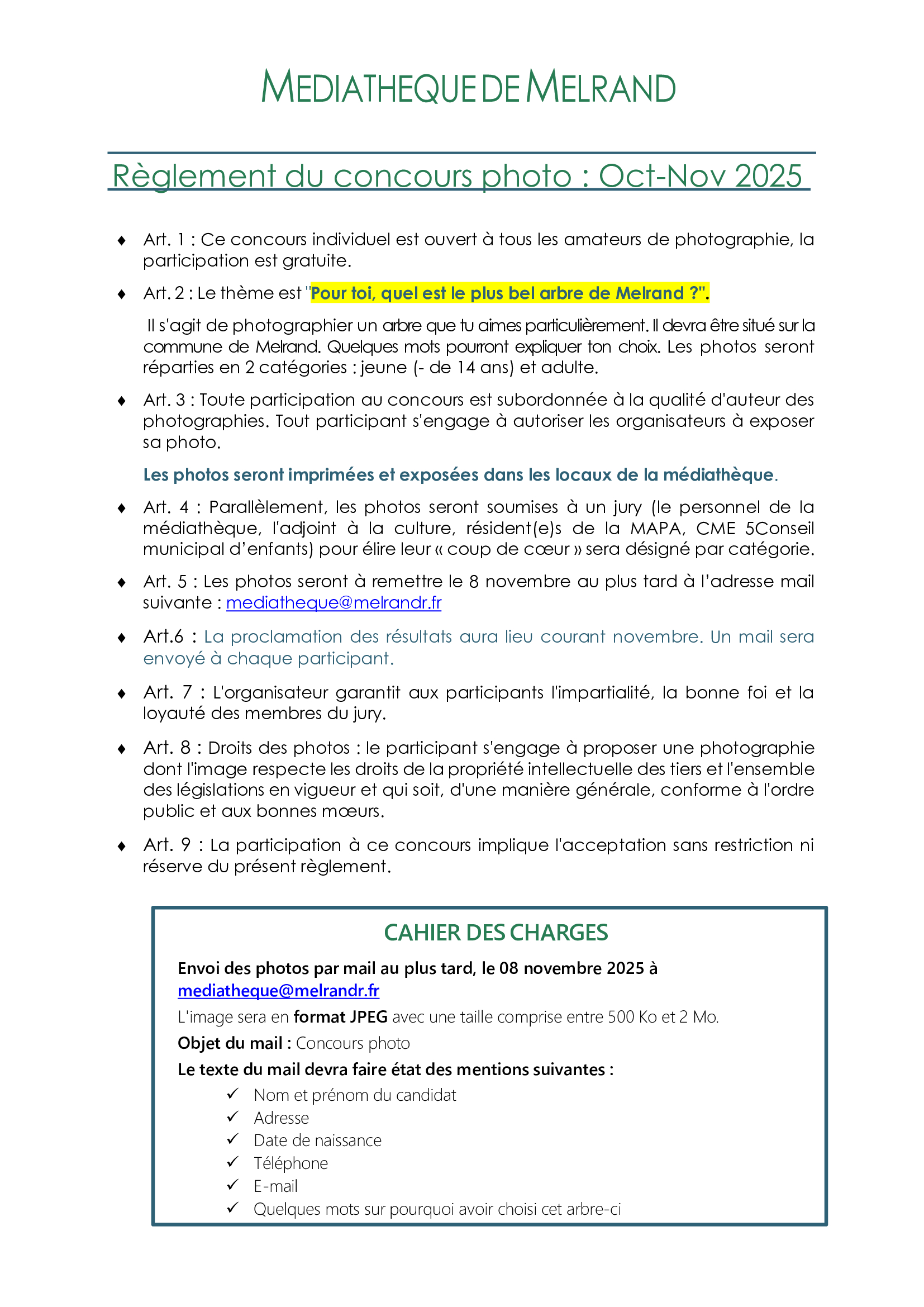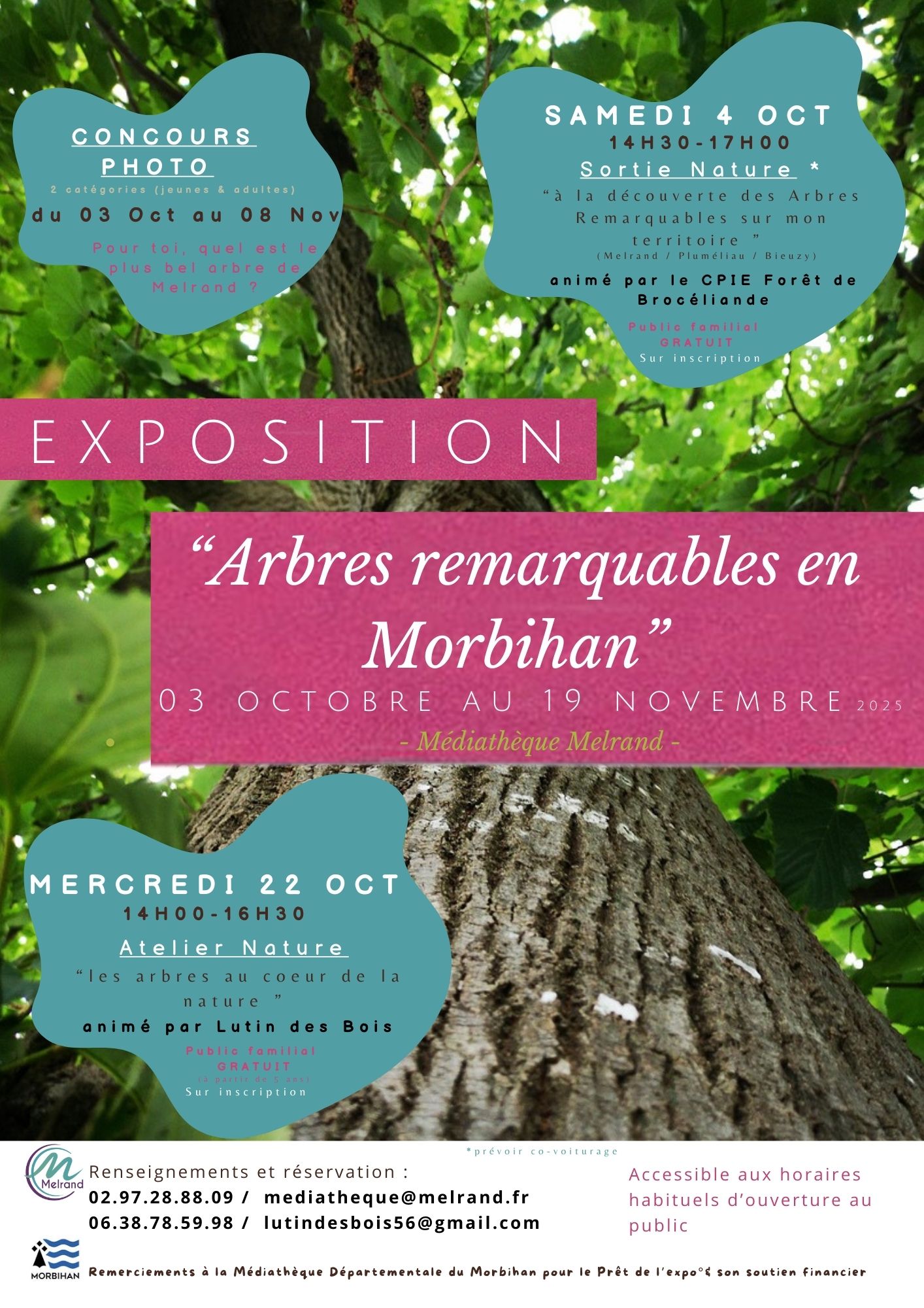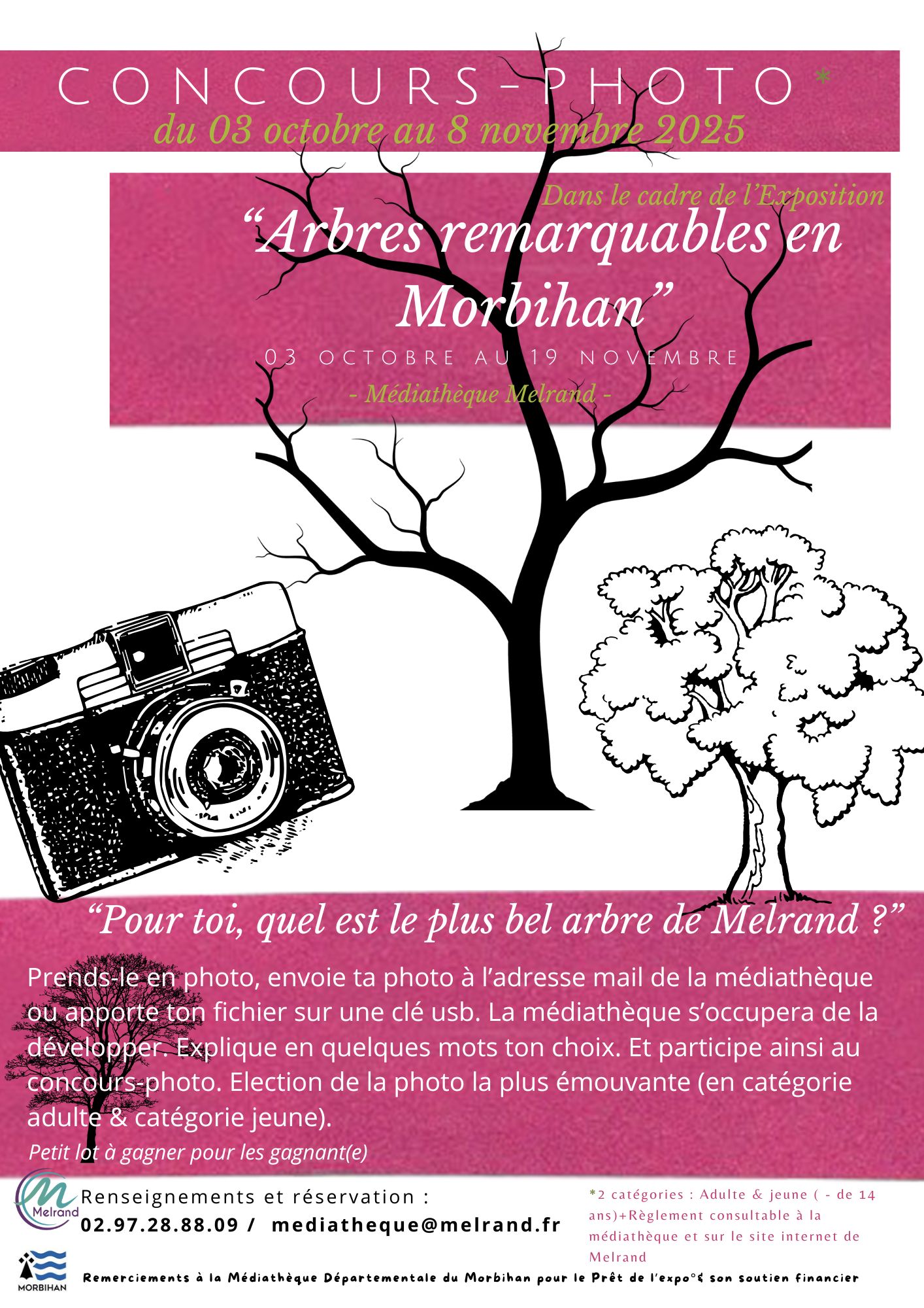 – Concours photo : « Pour toi, quel est le plus bel arbre de Melrand ? » Prends-le en photo, la médiathèque s’occupe de l’imprimer. Les photos seront exposées à la médiathèque et soumises à un jury pour l’élection de la photo la plus émouvante, ou drôle ou originale … Catégories adulte et jeune. Possibilité de déposer les fichiers jusqu’au 8 nov. Petit lot pour les gagnant(e)s.