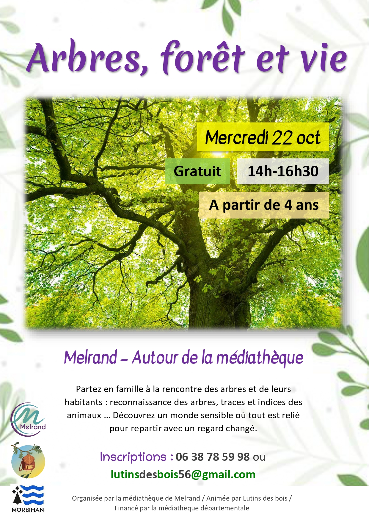 –Atelier Nature » Arbres, forêt & Vie » autour des Arbres et de la biodiversité proposé par Lutin des Bois, . RDV à la médiathèque de Melrand. Public familial (à partir de 5 ans). Gratuit. Sur inscription, soit directement à la médiathèque, soit auprès de Lutin des Bois : 06.38.78.59.98 ou lutindesbois56@gmail.com.