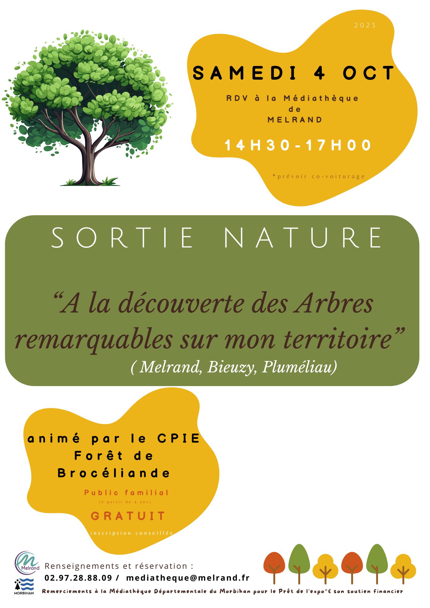 – Sortie Nature animée par le CPIE de la Forêt de Brocéliande : à la découverte des Arbres remarquables sur mon territoire (Melrand – Pluméliau – Bieuzy). RDV à la médiathèque de Melrand, Prévoir co-voiturage. Public familial. Gratuit.
