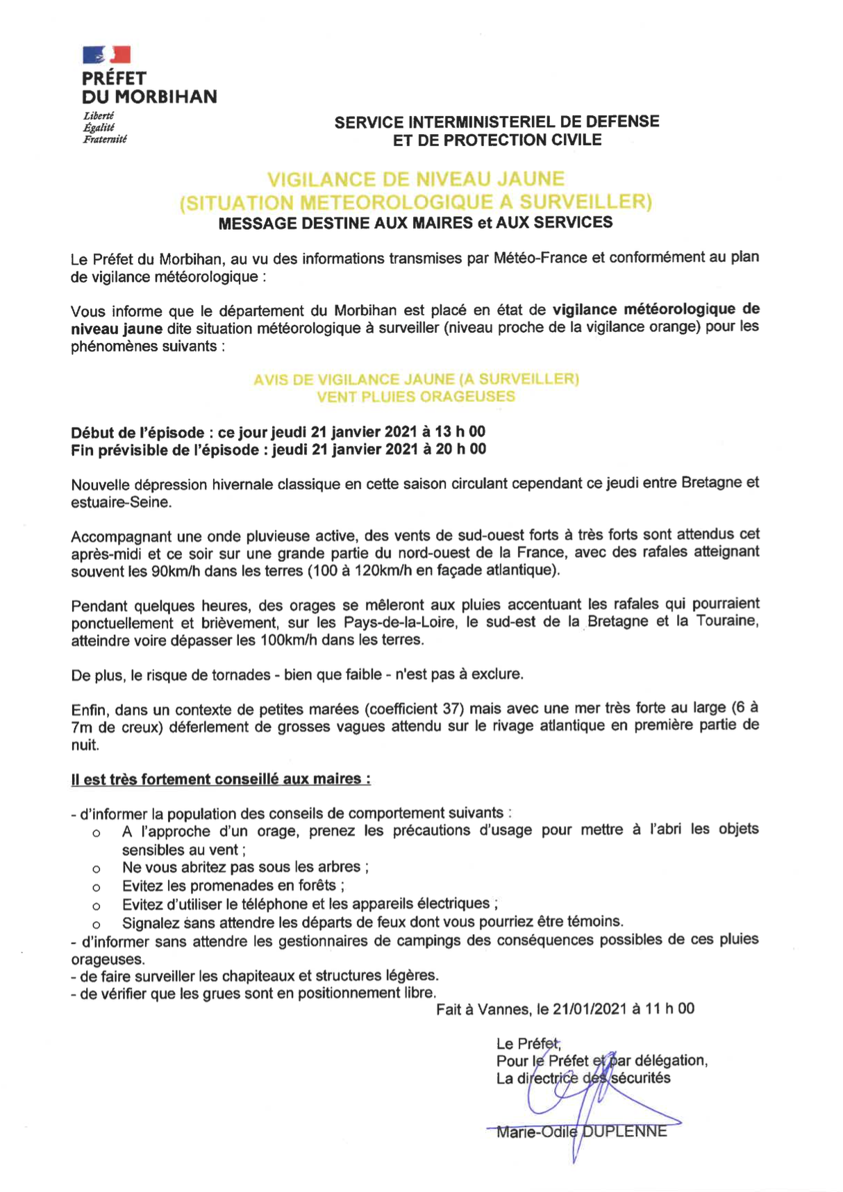 Accueil > Actualités > Vigilance de niveau jaune Vigilance de niveau jaune ActualitésPublié le 21 janvier 2021 Partagez cette page sur Découvrez nos autres actualités Publié le 31 octobre 2025Actualités CÉRÉMONIE DU 11 NOVEMBRE – 2025 Commémoration de l’Armistice du 11 novembre 1918 11 h 00, rendez-vous devant la mairie. 11 h 15, départ du défilé. […] En savoir plus Publié le 30 octobre 2025Actualités Enedis vous informe d’une coupure d’électricité programmée le 27/11/2025 sur la commune de MELRAND Afin d’améliorer la qualité de la distribution électrique, Enedis réalisera des travaux sur le réseau de distribution.Ces interventions entraîneront une […] En savoir plus Publié le 19 octobre 2025Actualités Départ à la retraite Le vendredi 26 septembre 2025, dans la salle du conseil, une cérémonie chaleureuse a réuni le maire, Charles Boulouard, les […] En savoir plus Publié le 12 octobre 2025Actualités VISITE AU SÉNAT Partis très tôt en tgv, le mercredi 1er octobre 2025, 8 jeunes élus du conseil municipal des enfants de Melrand, […] En savoir plus Publié le 12 octobre 2025Actualités Opération broyage en Octobre 2025 En savoir plus Publié le 12 octobre 2025Actualités Ateliers & Conférences à la médiathèque Le 1er mercredi des vacances, soit le 22 octobre, de 14h00 à 16h30, un Atelier Nature « Arbres, forêt et vie » […] En savoir plus Publié le 6 octobre 2025Actualités Réunion publique du PPRI du bassin versant du Blavet En savoir plus Publié le 30 septembre 2025Actualités Retour sur le repas des aînés du 28 septembre 2025 Le traditionnel repas des aînés qui constitue un véritable temps fort dans l’année, s’est déroulé dimanche 28 septembre dans la […] En savoir plus Toutes nos actualités