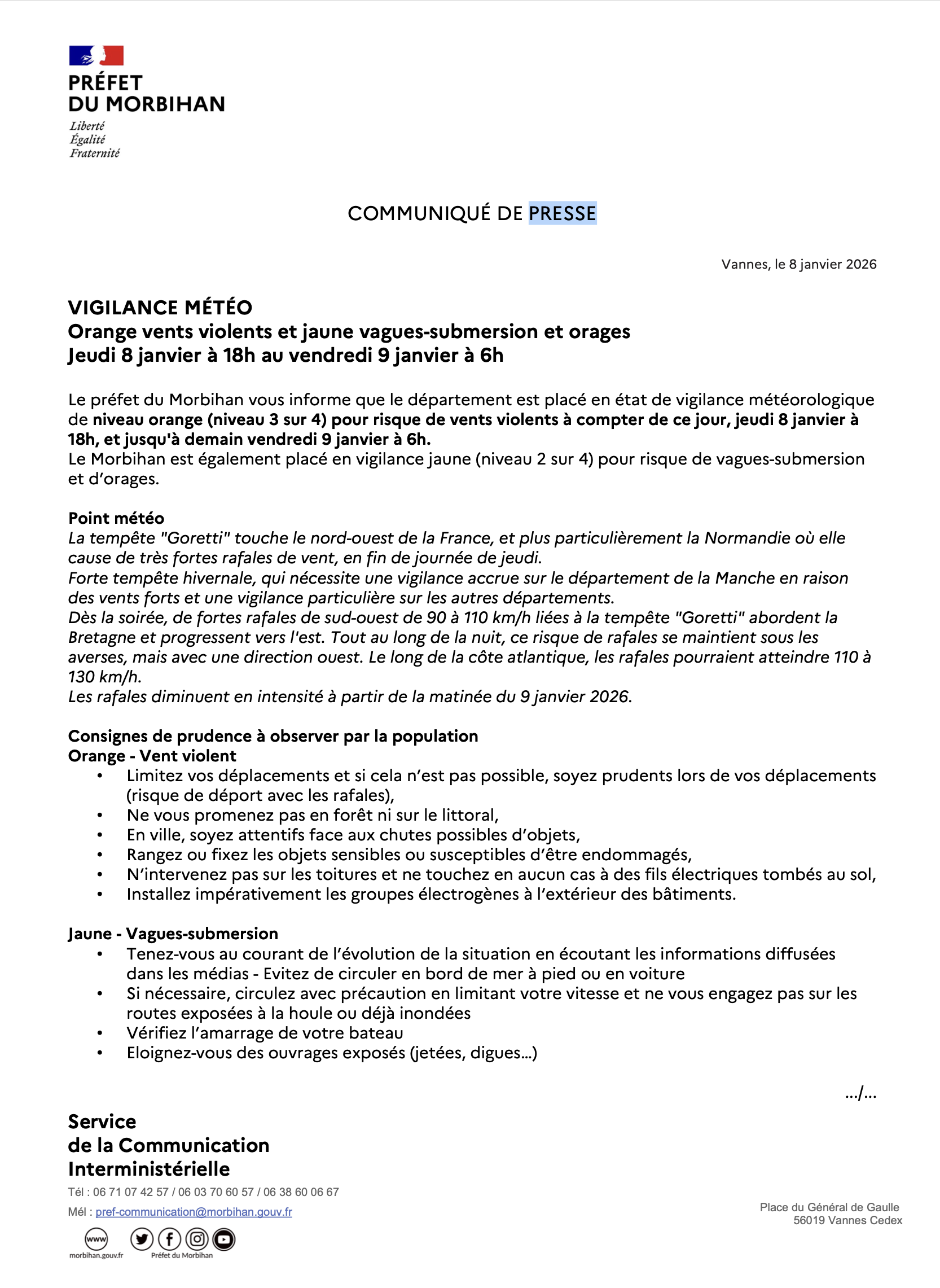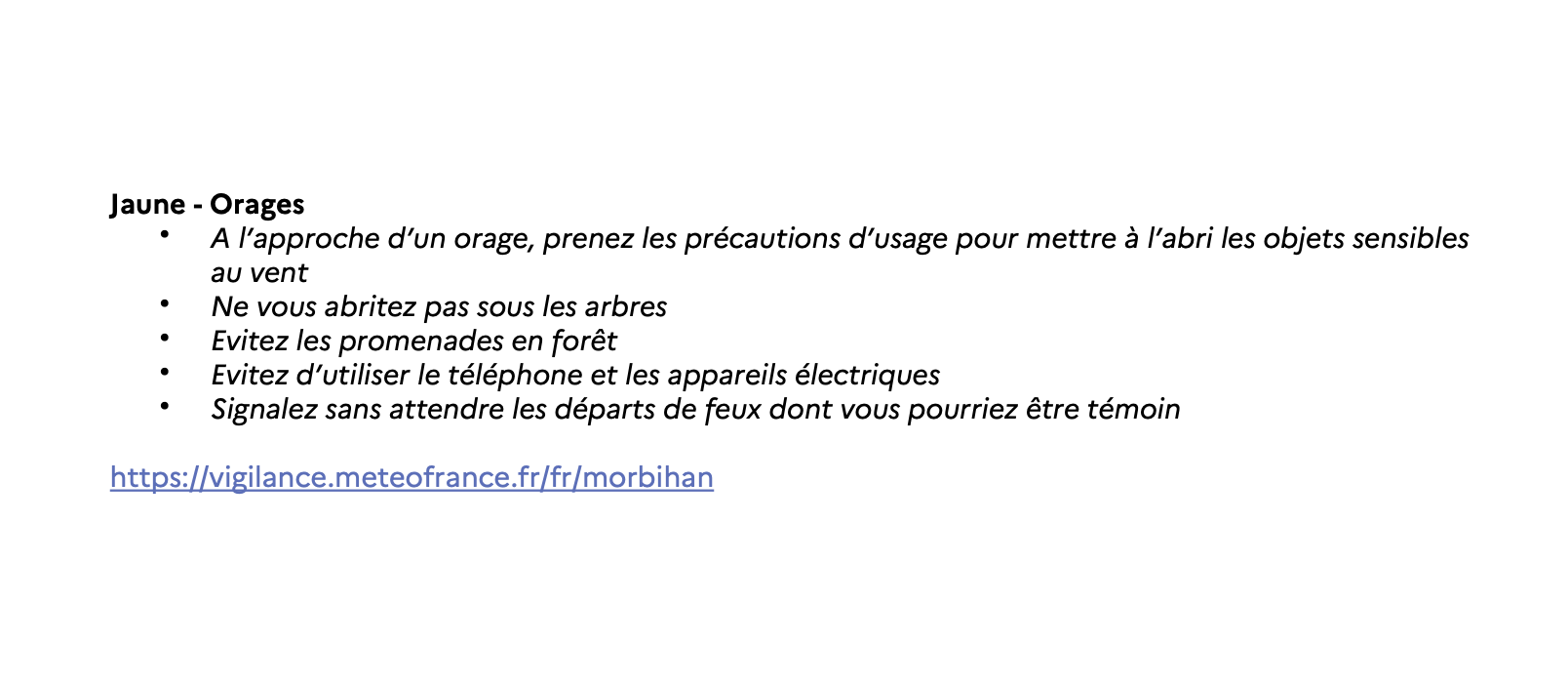 Accueil > Actualités > ⚠️ VIGILANCE MÉTÉO – MORBIHAN ⚠️ VIGILANCE MÉTÉO – MORBIHAN ActualitésPublié le 5 janvier 2026 AP-interdiction-tous-transports-scolaires AP-interdiction-tous-transports-scolaires - pdf - 83.69 Ko Partagez cette page sur Découvrez nos autres actualités Publié le 5 janvier 2026Actualités ⚠️ VIGILANCE MÉTÉO – MORBIHAN En savoir plus Publié le 21 décembre 2025Actualités La soirée des voeux au personnel Comme le veut la tradition, le maire de Melrand, Charles Boulouard, et l’ensemble du conseil municipal ont présenté leurs voeux […] En savoir plus Publié le 18 décembre 2025Actualités Horaires services de Baud Communauté Baud communauté vous informe de : la fermeture anticipée des accueils de Baud communauté et des déchèteries de MELRAND et […] En savoir plus Publié le 14 décembre 2025Actualités Le sapin de Noël illumine la place de l’église de Melrand L’illumination du sapin de Noël de Melrand s’est déroulée le samedi 13 décembre 2025 à 18h, sur la place de […] En savoir plus Publié le 12 décembre 2025Actualités CÉRÉMONIE DES VOEUX À LA POPULATION Le Maire et le Conseil Municipal vous souhaitent de très belles fêtes de fin d’année et une excellente année 2026 […] En savoir plus Publié le 11 décembre 2025Actualités Appel aux bonnes volontés Une réunion d’information est prévue le samedi 20 décembre à 10h00 à la salle polyvalente afin de présenter le projet […] En savoir plus Publié le 7 décembre 2025Actualités La magie de Noël arrive à Melrand ! La magie de Noël arrive à Melrand !Retrouvons-nous samedi 13 décembre 2026 à 18h sur la place pour l’illumination du […] En savoir plus Publié le 4 décembre 2025Actualités Boîte aux lettres du Père Noël Les enfants du Conseil Municipal vous invitent à déposer vos lettres dans la boîte aux lettres du Père Noël. N’oubliez […] En savoir plus Toutes nos actualités